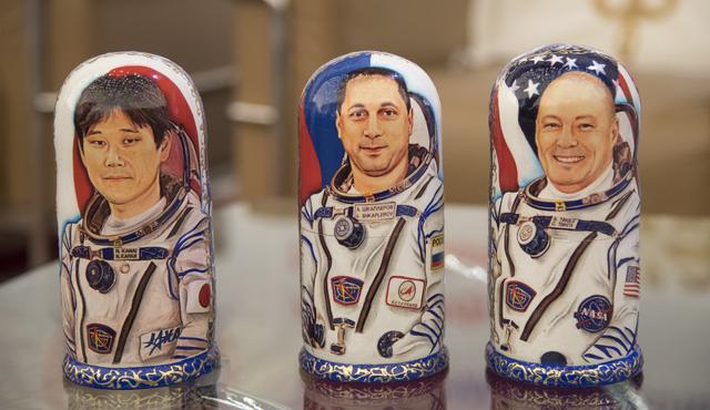 Matryoshka Dolls representing Expedition 55 crew members Norishige Kanai of the Japan Aerospace Exploration Agency (JAXA), left, Roscosmos cosmonaut Anton Shkaplerov, center, and NASA astronaut Scott Tingle are seen at a Karaganda Airport welcome ceremony in Kazakhstan on Sunday, June 3, 2018. Shkaplerov, Tingle, and Kanai are returning after 168 days in space where they served as members of the Expedition 54 and 55 crews onboard the International Space Station. Photo Credit: (NASA/Bill Ingalls)