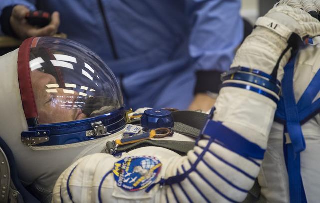 Expedition 56 flight engineer Alexander Gerst of ESA (European Space Agency) has his Russian Sokol suit pressure checked in preparation for launch aboard the Soyuz MS-09 spacecraft, Wednesday, June 6, 2018 at the Baikonur Cosmodrome in Kazakhstan. Gerst, flight engineer Serena Auñón-Chancellor of NASA, and Soyuz Commander Sergey Prokopyev of Roscosmos launched aboard the Soyuz MS-09 spacecraft at 7:12am EDT (5:12pm Baikonur time) on June 6 to begin their journey to the International Space Station. Photo Credit: (NASA/Joel Kowsky)