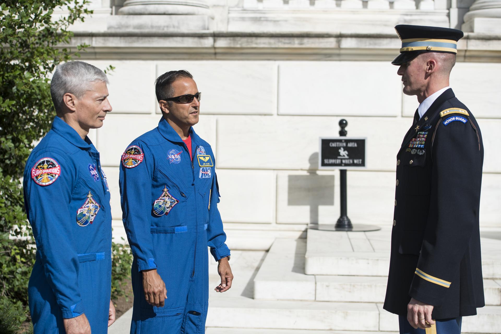 NASA astronauts Mark Vande Hei, left, and Joe Acaba, center, meet with the Honor Guard at the Tomb of the Unknowns, Friday, June 15, 2018 at the Arlington National Cemetery in Arlington, Va. Photo Credit: (NASA/Aubrey Gemignani)