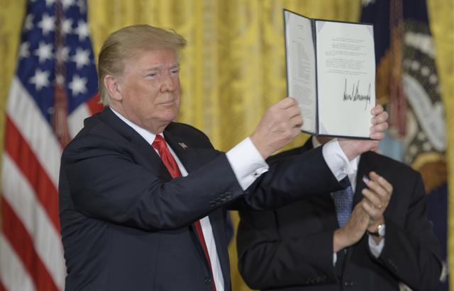 President Donald Trump holds up Space Policy Directive - 3 after signing it during a meeting of the National Space Council in the East Room of the White House, Monday, June 18, 2018, in Washington. Chaired by the Vice President, the council's role is to advise the President regarding national space policy and strategy, and review the nation's long-range goals for space activities. Photo Credit: (NASA/Bill Ingalls)