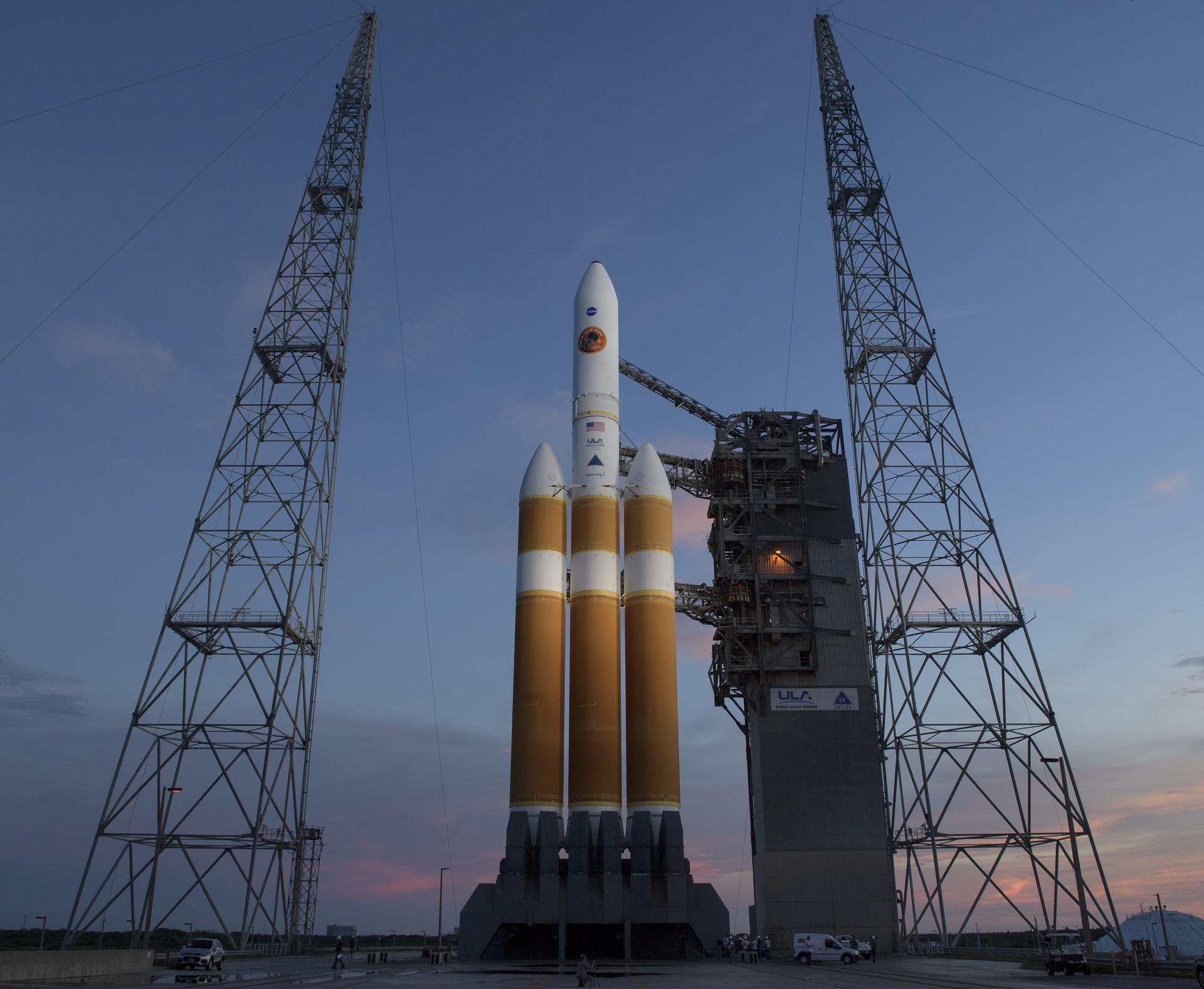 The United Launch Alliance Delta IV Heavy rocket with the Parker Solar Probe onboard is seen shortly after the Mobile Service Tower was rolled back, Friday, Aug. 10, 2018, Launch Complex 37 at Cape Canaveral Air Force Station in Florida. Parker Solar Probe is humanity’s first-ever mission into a part of the Sun’s atmosphere called the corona. Here it will directly explore solar processes that are key to understanding and forecasting space weather events that can impact life on Earth. Photo Credit: (NASA/Bill Ingalls)
