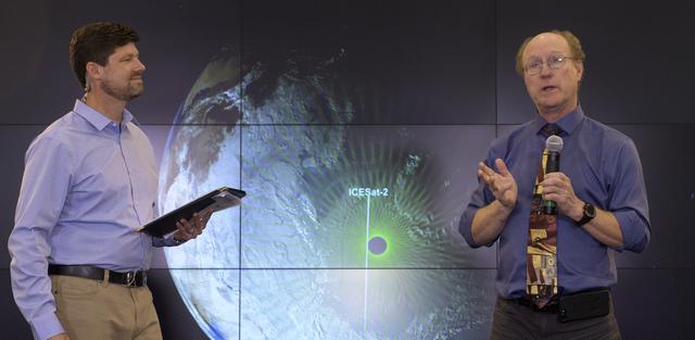 Tom Wagner, ICESat-2 Program Scientist, NASA Headquarters, left, and Doug McLennan, ICESat-2 Project Manager, NASA's Goddard Space Flight Center, are seen during a NASA Ice, Cloud and land Elevation Satellite-2 (ICESat-2) prelaunch briefing, Thursday, Sept. 13, 2018, at Vandenberg Air Force Base in California. The ICESat-2 mission will measure the changing height of Earth's ice. Photo Credit: (NASA/Bill Ingalls)