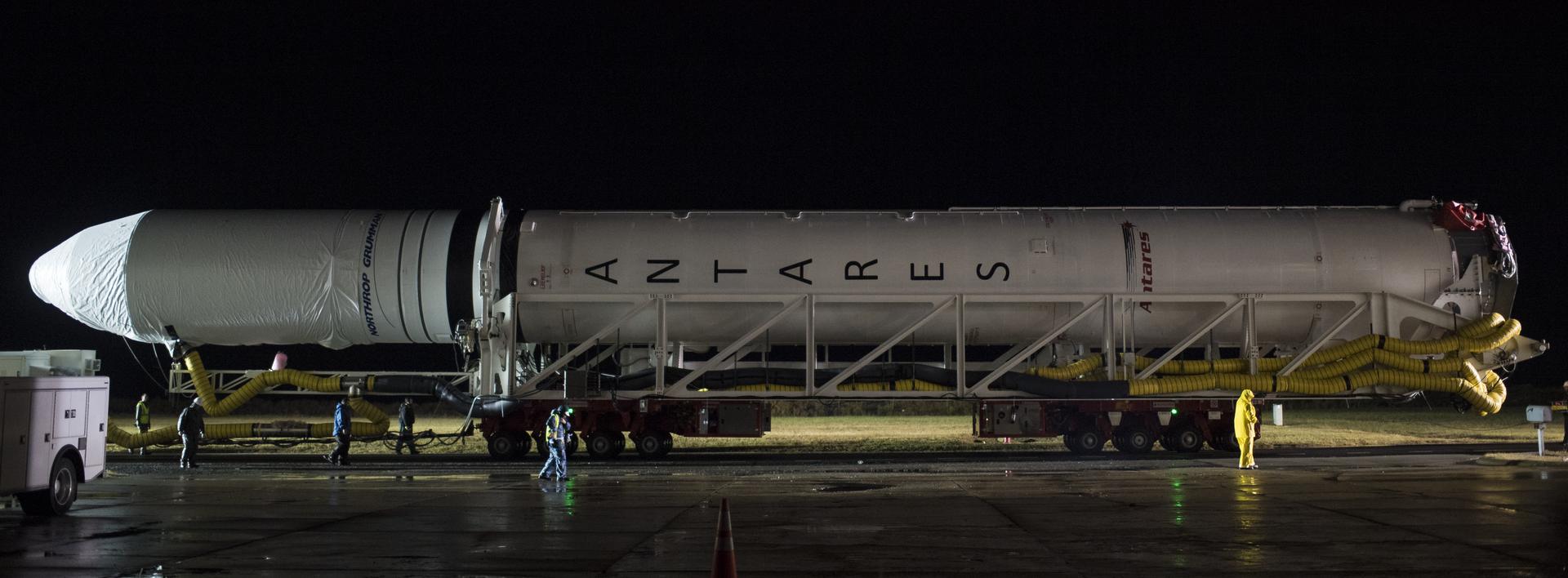 A Northrop Grumman Antares rocket is seen as it is rolled from the Horizontal Integration Facility (HIF) to Pad-0A, Monday, Nov. 12, 2018 at NASA's Wallops Flight Facility in Virginia. Northrop Grumman's 10th contracted cargo resupply mission for NASA to the International Space Station will deliver about 7,500 pounds of science and research, crew supplies and vehicle hardware to the orbital laboratory and its crew. Launch is scheduled for Nov. 15 at 4:49 a.m. EST. Photo Credit: (NASA/Joel Kowsky)