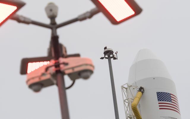 A bald eagle is seen atop a lightning tower next to the Northrop Grumman Antares rocket with, Cygnus spacecraft onboard, at Pad-0A, Wednesday, Nov. 14, 2018 at NASA's Wallops Flight Facility in Virginia. Northrop Grumman's 10th contracted cargo resupply mission for NASA to the International Space Station will deliver about 7,400 pounds of science and research, crew supplies and vehicle hardware to the orbital laboratory and its crew. Launch is currently scheduled for Nov. 16 at 4:23 a.m. EST. Photo Credit: (NASA/Joel Kowsky)