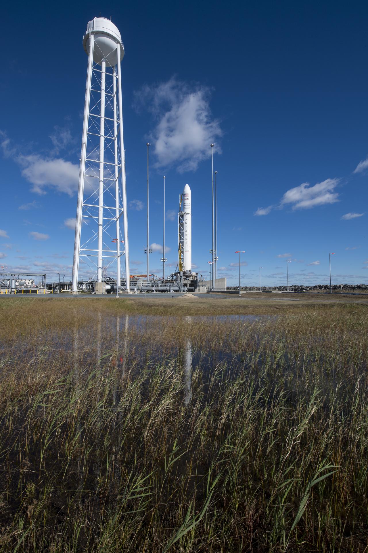 The Northrop Grumman Antares rocket, with Cygnus resupply spacecraft onboard, is seen on Pad-0A, Friday, Nov. 16, 2018 at NASA's Wallops Flight Facility in Virginia. Northrop Grumman's 10th contracted cargo resupply mission for NASA to the International Space Station will deliver about 7,400 pounds of science and research, crew supplies and vehicle hardware to the orbital laboratory and its crew. Launch is currently scheduled for Nov. 17 at 4:01 a.m. EST. Photo Credit: (NASA/Joel Kowsky)