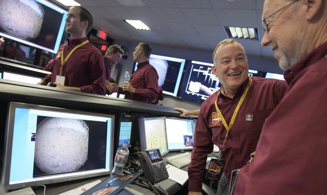 Tom Hoffman, InSight Project Manager, NASA JPL, left, and Bruce Banerdt, InSight Principal Investigator, NASA JPL, laugh together after reviewing the first image of Mars taken by the Mars InSight lander, Monday, Nov. 26, 2018 inside the Mission Support Area at NASA's Jet Propulsion Laboratory in Pasadena, California. InSight, short for Interior Exploration using Seismic Investigations, Geodesy and Heat Transport, is a Mars lander designed to study the "inner space" of Mars: its crust, mantle, and core. Photo Credit: (NASA/Bill Ingalls)