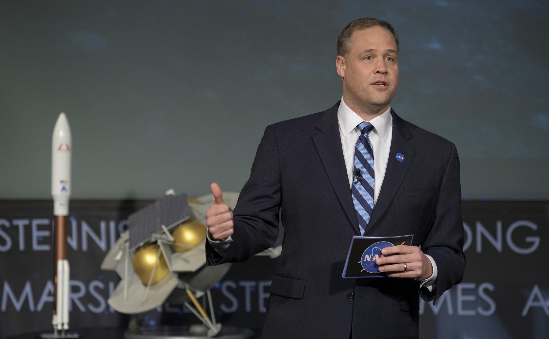 NASA Administrator Jim Bridenstine announces the nine U.S. companies that are eligible to bid on NASA delivery services to the lunar surface through Commercial Lunar Payload Services (CLPS) contracts, Thursday, Nov. 29, 2018 at NASA Headquarters in Washington. The companies will be able to bid on delivering science and technology payloads for NASA, including payload integration and operations, launching from Earth and landing on the surface of the Moon. NASA expects to be one of many customers that will use these commercial landing services. Photo Credit: (NASA/Bill Ingalls)