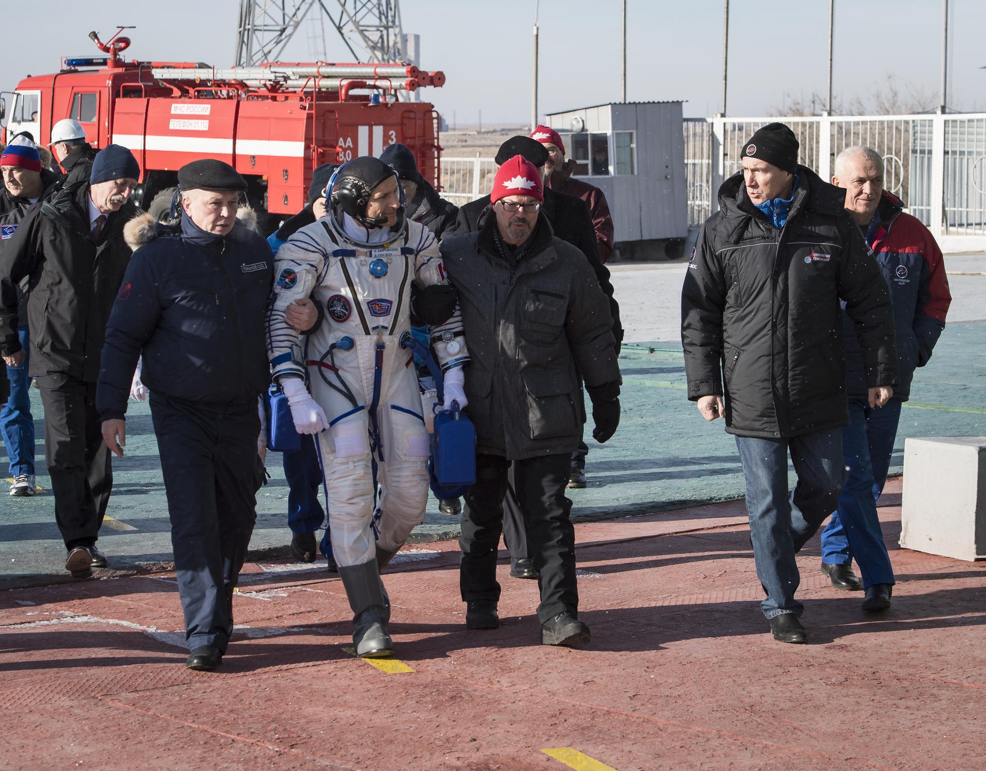 Expedition 58 Flight Engineer David Saint-Jacques is walked to the Soyuz vehicle for launch by Sylvain Laporte, president, Canadian Space Agency (CSA), second from right, Monday, Dec. 3, 2018 in Baikonur, Kazakhstan. Saint-Jacques, Soyuz Commander Oleg Kononenko of Roscosmos, and Flight Engineer Anne McClain of NASA, will spend the next six and a half months onboard the International Space Station. Photo Credit: (NASA/Aubrey Gemignani)