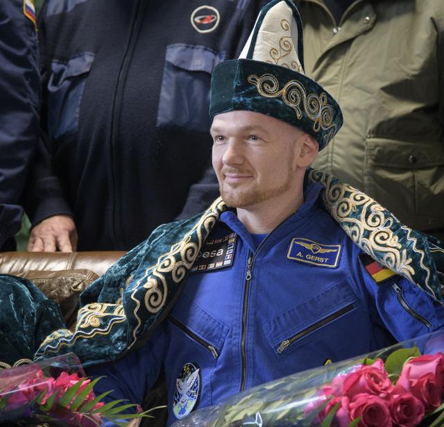 Expedition 57 crew member Alexander Gerst of ESA (European Space Agency) is seen during a welcome ceremony at the Zhezkazgan, Kazakhstan airport shortly after he landed in a Soyuz MS-09 spacecraft with Sergey Prokopyev of Roscosmos, and Serena Auñón-Chancellor of NASA on Thursday, Dec. 20, 2018. Auñón-Chancellor, Gerst, and Prokopyev are returning after 197 days in space where they served as members of the Expedition 56 and 57 crews onboard the International Space Station. Photo Credit: (NASA/Bill Ingalls)