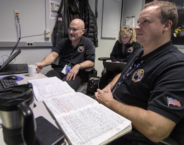 New Horizons Mission Systems Engineer Chris Hersman, left, New Horizons Project Manager Helene Winters, and New Horizons Deputy Mission Systems Engineer Gabe Rogers, right, all of the Johns Hopkins Applied Physics Laboratory, wait for a signal from the spacecraft that it is healthy and collected data during the flyby of Ultima Thule, Tuesday, Jan. 1, 2019 at the Mission Operations Center of the Johns Hopkins University Applied Physics Laboratory (APL) in Laurel, Maryland. Photo Credit: (NASA/Bill Ingalls)