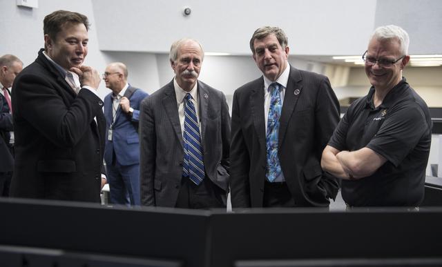SpaceX CEO and Chief Designer Elon Musk, left, NASA Associate Administrator for the Human Exploration and Operations Mission Directorate William Gerstenmaier, second from left, NASA International Space Station Program Manager Kirk Shireman, second from right, and SpaceX Director of Crew Mission Management Benji Reed, right, watch the progress of the Crew Dragon spacecraft after launch from firing room four of the Launch Control Center, Saturday, March 2, 2019 at the Kennedy Space Center in Florida. The Demo-1 mission is the first launch of a commercially built and operated American spacecraft and space system designed for humans as part of NASA's Commercial Crew Program. The mission will serve as an end-to-end test of the system's capabilities. Photo Credit: (NASA/Joel Kowsky)