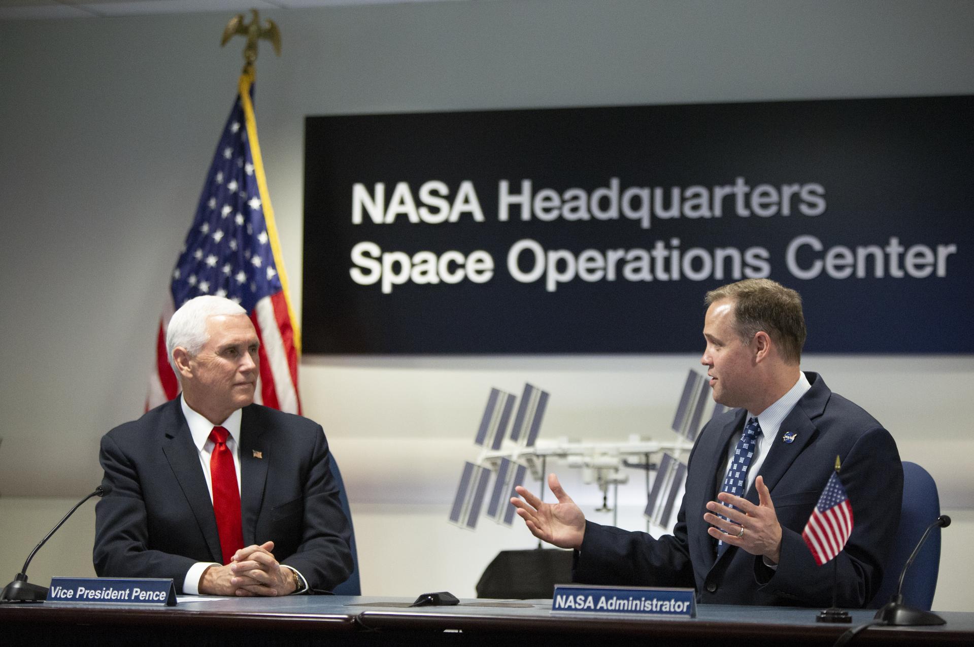 Vice President Mike Pence, left, and NASA Administrator Jim Bridenstine, right, speak with Expedition 58 flight engineer Anne McClain of NASA, and flight engineer David Saint-Jacques of the Canadian Space Agency (CSA) who are onboard the International Space Station, Wednesday, March 6, 2019 from the Space Operations Center at NASA Headquarters in Washington. Vice President Pence and Administrator Bridenstine spoke with the astronauts about the arrival of SpaceX's Crew Dragon spacecraft at the International Space Station. Photo Credit: (NASA/Joel Kowsky)