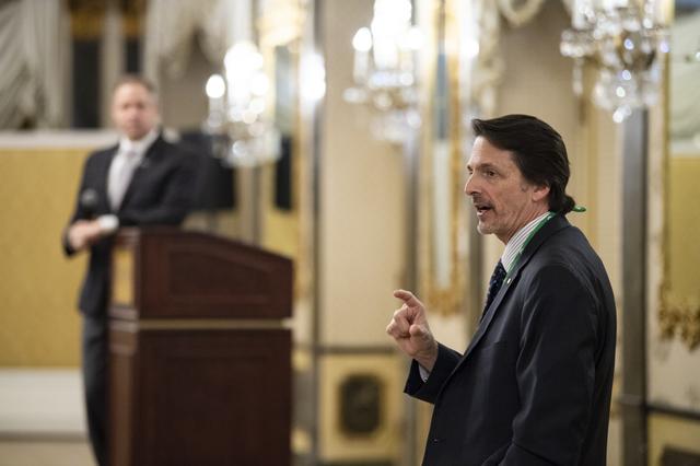 NASA Administrator Jim Bridenstine listens as NASA staff give updates on center priorities at an agency meeting at the Space Symposium, Monday, April 8, 2019, at the Broadmoor Hotel in Colorado Springs, Colorado. Senior NASA officials from NASA centers around the country were in attendance. Photo credit: (NASA/Aubrey Gemignani)