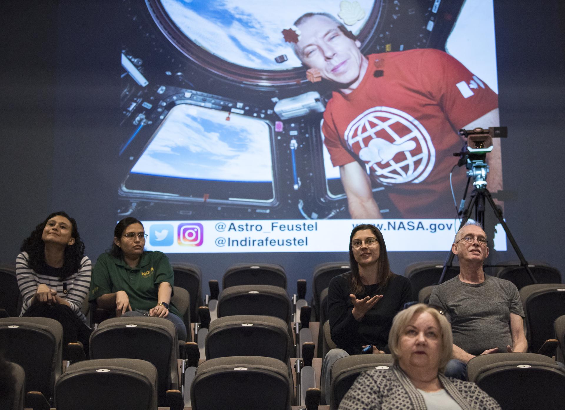 An audience member asks a question after NASA astronaut Drew Feustel gave a presentation about his experience on two shuttle missions, STS-125 and STS-134, as well as Expeditions 55 and 56 on the International Space Station, at Northern Virginia Community College's Alexandria campus, Monday, May 6, 2019 in Virginia. Photo Credit: (NASA/Aubrey Gemignani)