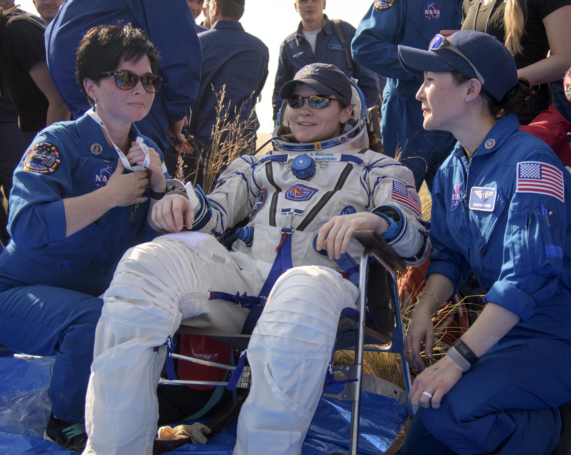 Expedition 59 crew member Anne McClain of NASA is seen outside the Soyuz MS-11 spacecraft after she landed with Canadian Space Agency astronaut David Saint-Jacques and Roscosmos cosmonaut Oleg Kononenko in a remote area near the town of Zhezkazgan, Kazakhstan on Tuesday, June 25, 2019 Kazakh time (June 24 Eastern time). McClain, Saint-Jacques, and Kononenko are returning after 204 days in space where they served as members of the Expedition 58 and 59 crews onboard the International Space Station. Photo Credit: (NASA/Bill Ingalls)