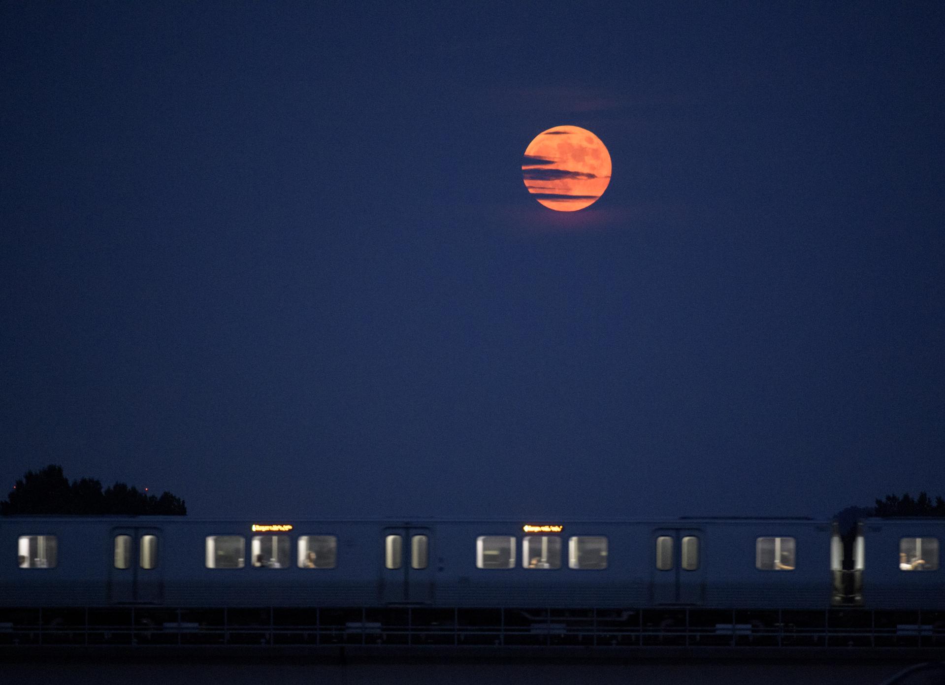 The Moon rises as a Metrorail car crosses the Potomac river in Washington 50 years to the day after astronauts Neil Armstrong, Michael Collins, and Buzz Aldrin launched on Apollo 11, the first mission to land astronauts on the Moon, Tuesday, July 16, 2019. Photo Credit: (NASA/Bill Ingalls)