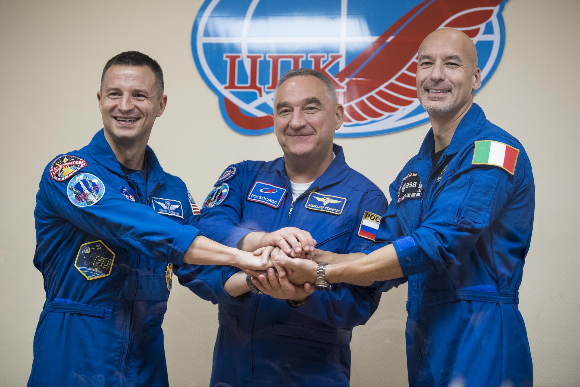 Expedition 60 flight engineer Andrew Morgan of NASA, left, Soyuz Commander Alexander Skvortsov of Roscosmos, center, and flight engineer Luca Parmitano of ESA (European Space Agency), right, pose for a picture at the conclusion of a press conference, Friday, July 19, 2019 at the Cosmonaut Hotel in Baikonur, Kazakhstan. Morgan, Skvortsov, and Parmitano are scheduled to launch to the International Space Station aboard the Soyuz MS-13 spacecraft at 12:28 p.m. Eastern time (9:28 p.m. Baikonur time) on Saturday, July 20. Photo Credit: (NASA/Joel Kowsky)