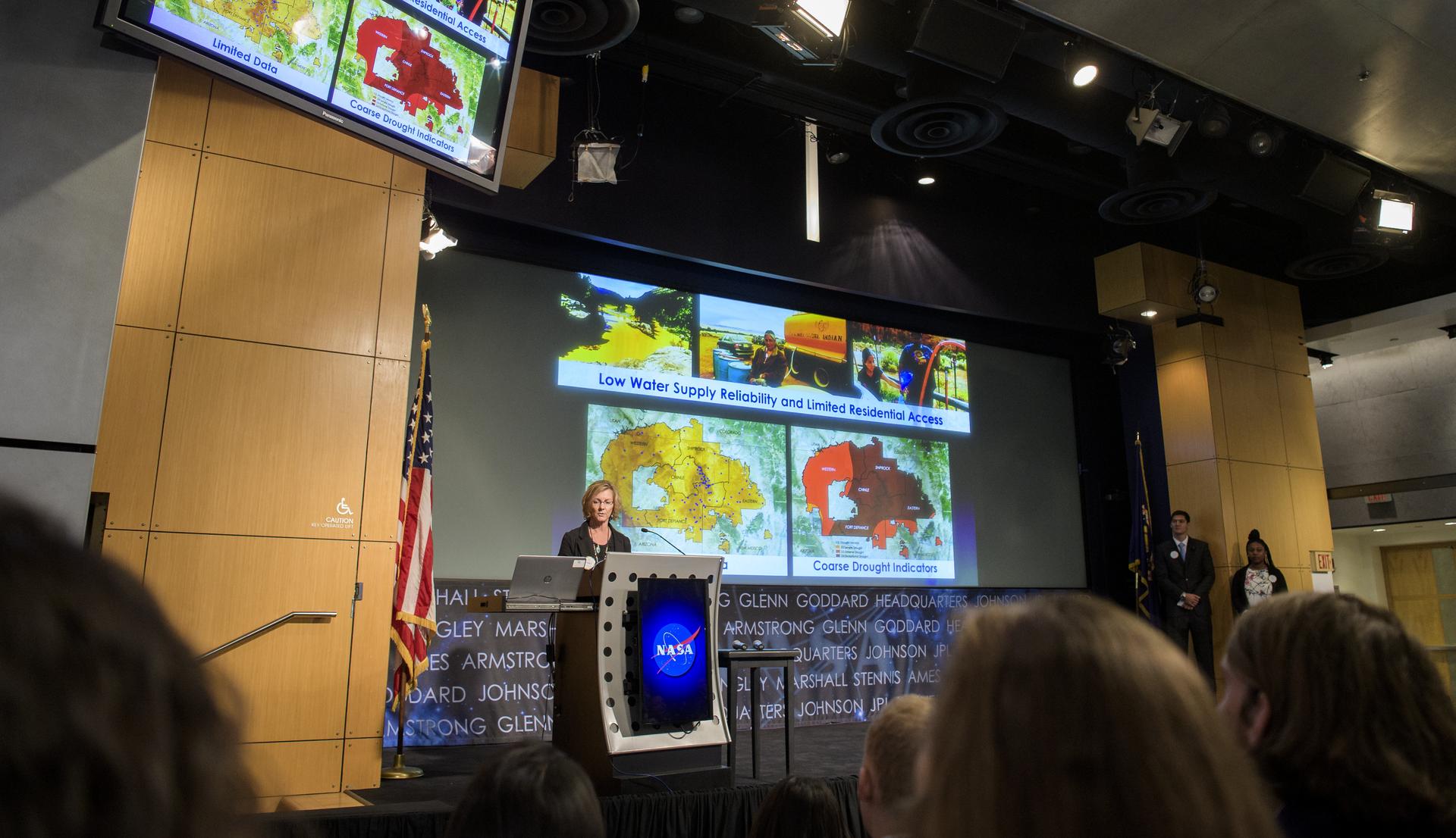 Cindy Schmidt, a research scientist in the Earth Science Division at NASA's Ames Research Center, speaks about the Indigenous Peoples Pilot and drought monitoring in the Navajo Nation during the 2019 Annual Earth Science Applications Showcase, Thursday, Aug. 1, 2019 at NASA Headquarters in Washington, DC. Every summer students and young professionals from NASA’s Applied Sciences’ DEVELOP National Program come to NASA Headquarters and present their research projects. DEVELOP is a training and development program where students work on Earth science research projects, mentored by science advisers from NASA and partner agencies, and extend research results to local communities. Photo Credit: (NASA/Joel Kowsky)