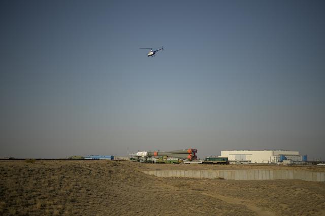 The Soyuz rocket is rolled out by train to the launch pad, Monday, Sept. 23, 2019 at the Baikonur Cosmodrome in Kazakhstan. Expedition 61 crewmembers Jessica Meir of NASA and Oleg Skripochka of Roscosmos, and spaceflight participant Hazzaa Ali Almansoori of the United Arab Emirates will launch September 25th on the Soyuz MS-15 spacecraft from the Baikonur Cosmodrome to the International Space Station. Photo Credit: (NASA/Bill Ingalls)