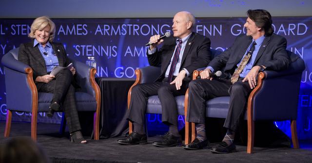 Jody Singer, Director of NASA’s Marshall Space Flight Center, left, Ken Bowersox, acting Associate Administrator for NASA's Human Exploration and Operations Mission Directorate, center, and Steve Clarke, Deputy Associate Administrator for Exploration in NASA’s Science Mission Directorate, right, discuss the agency’s Artemis program during an interactive STEM discussion with students attending the 70th International Astronautical Congress, Wednesday, Oct. 23, 2019, at NASA Headquarters in Washington. Photo Credit: (NASA/Joel Kowsky)