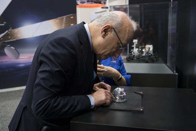 Philippe Étienne, French Ambassador to the U.S. touches a Mars meteorite at the NASA exhibit during the 70th International Astronautical Congress, Wednesday, Oct. 23, 2019, at the Walter E. Washington Convention Center in Washington. Photo credit: (NASA/Aubrey Gemignani)