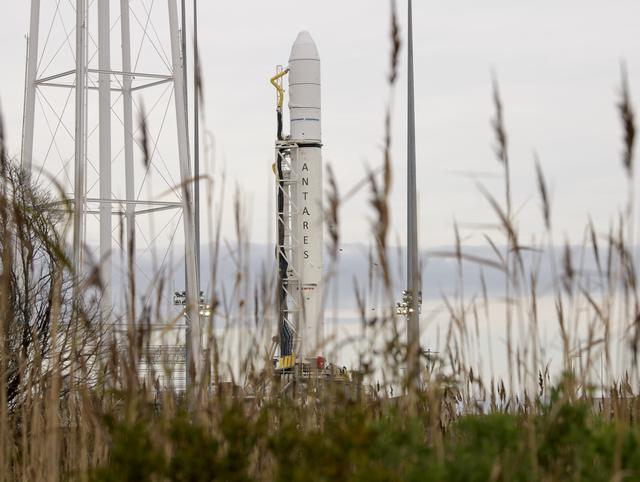The Northrop Grumman Antares rocket is seen a few hours after arriving at launch Pad-0A, Tuesday, Oct. 29, 2019, at NASA's Wallops Flight Facility in Virginia. Northrop Grumman’s 12th contracted cargo resupply mission with NASA to the International Space Station will deliver about 8,200 pounds of science and research, crew supplies and vehicle hardware to the orbital laboratory and its crew. Launch is scheduled for 9:59 a.m. EDT Saturday, Nov. 2. Photo Credit: (NASA/Bill Ingalls)
