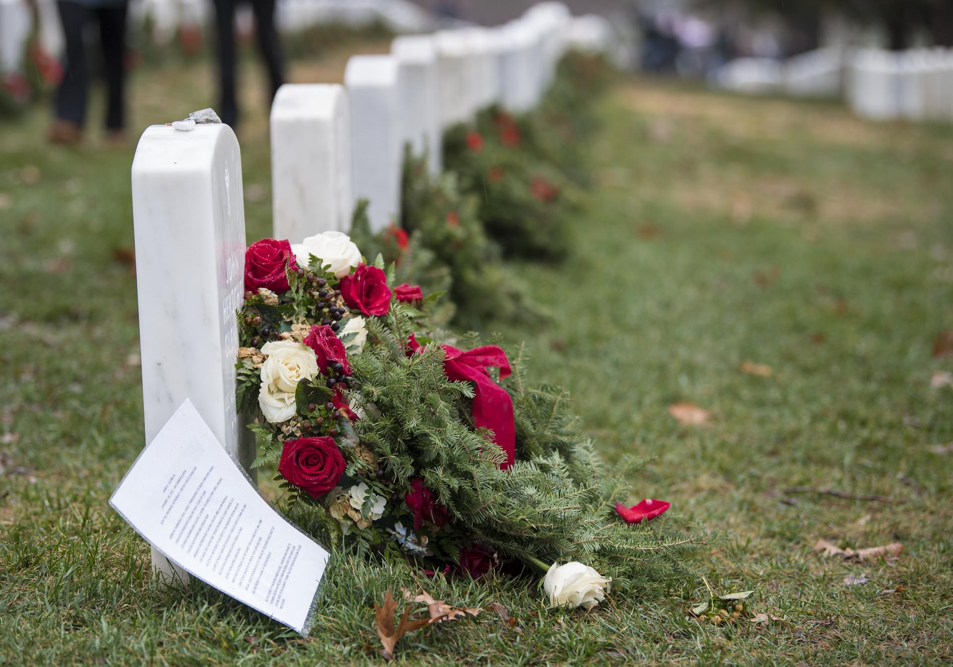 The headstone of former astronaut and U.S. Senator John Glenn is seen on National Wreaths Across America Day at Arlington National Cemetery, Sat., Dec. 14, 2019 in Arlington, Va. National Wreaths Across America Day is held annually to celebrate the lives of military veterans. NASA astronaut Doug Wheelock attended to honor those who lost their lives in the quest for space exploration as well as fellow service members. Photo Credit: (NASA/Aubrey Gemignani)