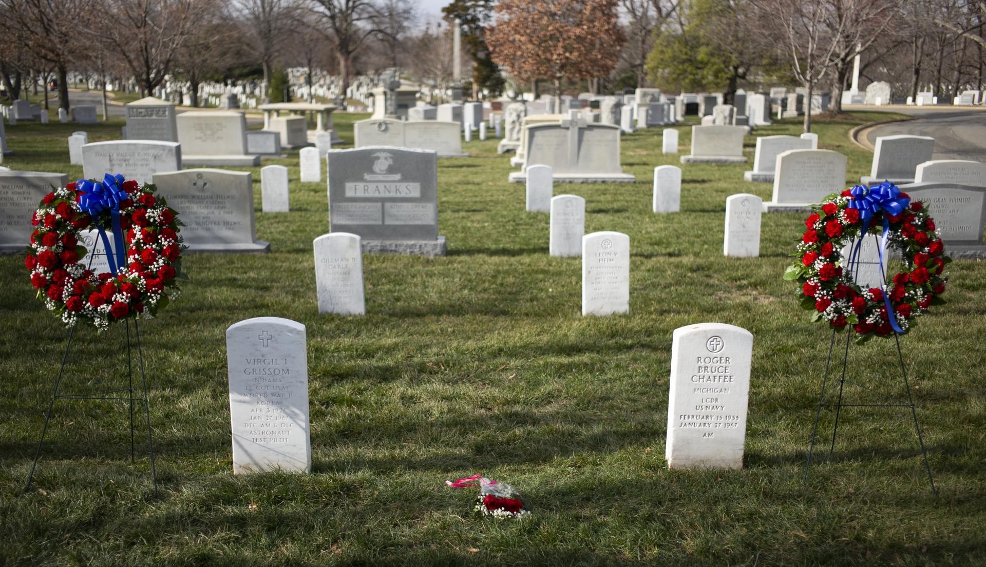 The grave markers of Apollo 1 astronauts Virgil “Gus” Grissom and Roger Chaffee are seen after a wreath laying ceremony that was part of NASA’s Day of Remembrance, Thursday, Jan. 30, 2020, at Arlington National Cemetery in Arlington, Va. The wreaths were laid in memory of those men and women who lost their lives in the quest for space exploration. Photo Credit: (NASA/Joel Kowsky)