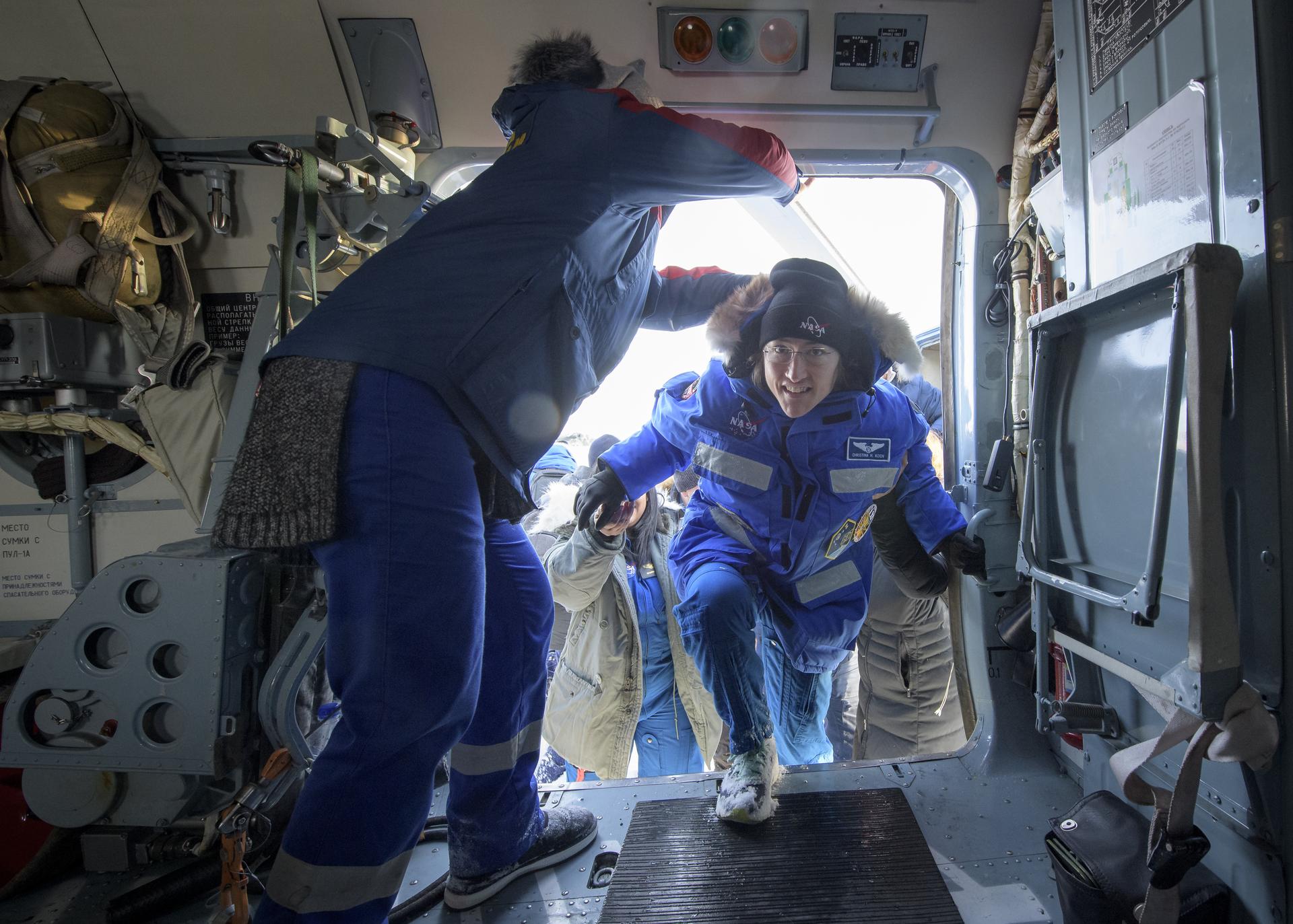 NASA astronaut Christina Koch boards a Russian MI-8 helicopter after she, ESA astronaut Luca Parmitano, and Roscosmos cosmonaut Alexander Skvortsov landed in their Soyuz MS-13 spacecraft near the town of Zhezkazgan, Kazakhstan on Thursday, Feb. 6, 2020. Koch returned to Earth after logging 328 days in space --- the longest spaceflight in history by a woman --- as a member of Expeditions 59-60-61 on the International Space Station. Skvortsov and Parmitano returned after 201 days in space where they served as Expedition 60-61 crew members onboard the station. Photo Credit: (NASA/Bill Ingalls)