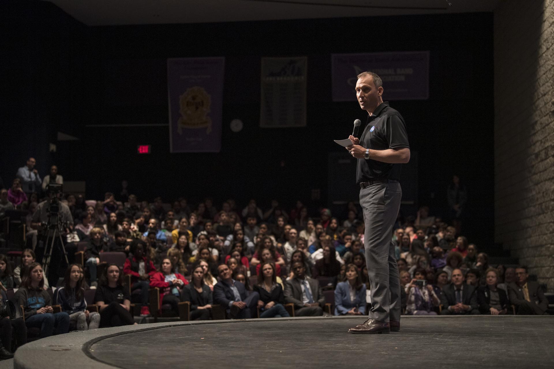 Associate Administrator of NASA's Science Mission Directorate, Thomas Zurbuchen, announces the official name, Perseverance, for the rover formerly known as Mars 2020, Thursday, March 5, 2020, at Lake Braddock Secondary School in Burke, Va. Zurbuchen made the final selection of the new name following a nationwide naming contest conducted in 2019 that drew more than 28,000 essays by K-12 students from every U.S. state and territory. Perseverance is currently at NASA's Kennedy Space Center in Florida being prepared for launch this summer. Photo Credit: (NASA/Aubrey Gemignani)
