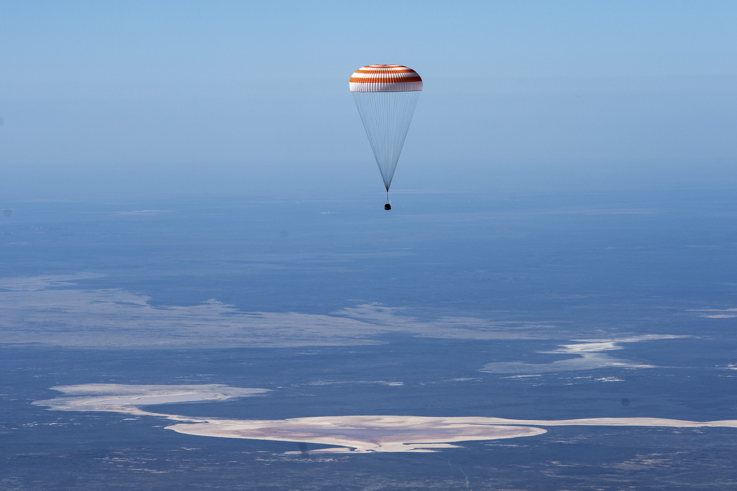 The Soyuz MS-15 spacecraft is seen as it lands in a remote area near the town of Zhezkazgan, Kazakhstan with Expedition 62 crew members Jessica Meir and Drew Morgan of NASA, and Oleg Skripochka of Roscosmos, Friday, April 17, 2020. Meir and Skripochka returned after 205 days in space, and Morgan after 272 days in space. All three served as Expedition 60-61-62 crew members onboard the International Space Station. Photo Credit: (NASA/GCTC/Andrey Shelepin)