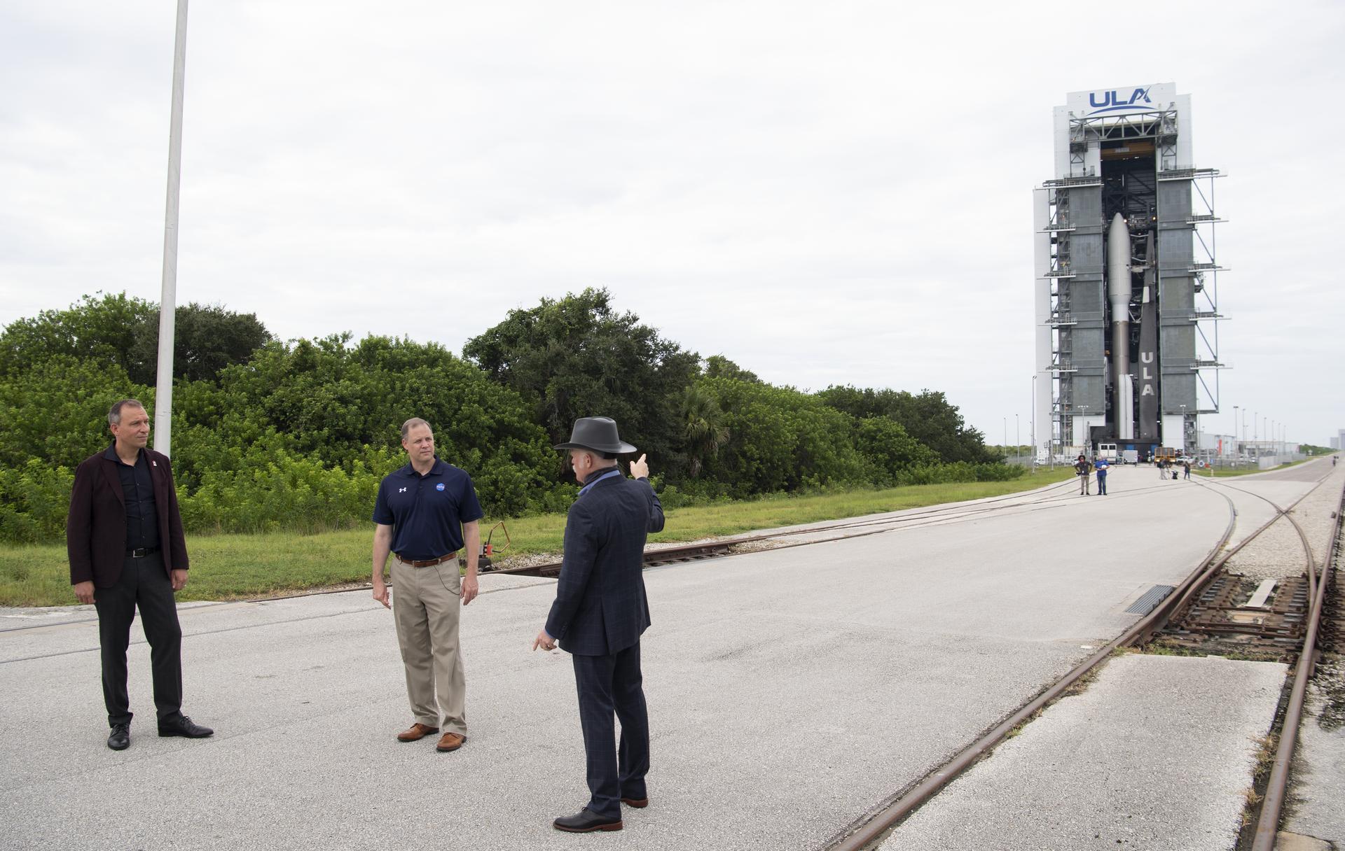 Thomas Zurbuchen, Associate Administrator for NASA's Science Mission Directorate, left, NASA Administrator Jim Bridenstine, and Tory Bruno, president and CEO of United Launch Alliance, are seen before the rollout of a United Launch Alliance Atlas V rocket with NASA’s Mars 2020 Perseverance to the launch pad at Space Launch Complex 41, Tuesday, July 28, 2020, at Cape Canaveral Air Force Station in Florida. The Perseverance rover is part of NASA’s Mars Exploration Program, a long-term effort of robotic exploration of the Red Planet. Launch is scheduled for Thursday, July 30. Photo Credit: (NASA/Joel Kowsky)