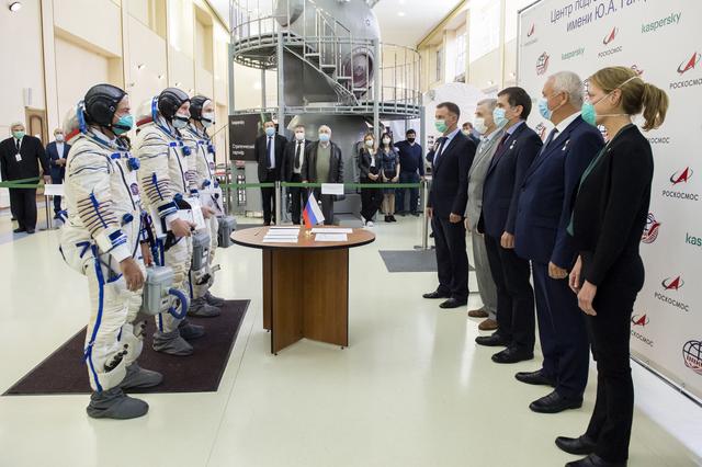 Expedition 64 backup crew members NASA astronaut Mark Vande Hei, left, Russian cosmonaut Oleg Novitskiy of Roscosmos, center, and Russian cosmonaut Petr Dubrov of Roscosmos, meet with mission managers ahead of their Soyuz qualification exams, Tuesday, Sept. 22, 2020 at the Gagarin Cosmonaut Training Center (GCTC) in Star City, Russia. Photo Credit: (NASA/GCTC/Irina Spector)