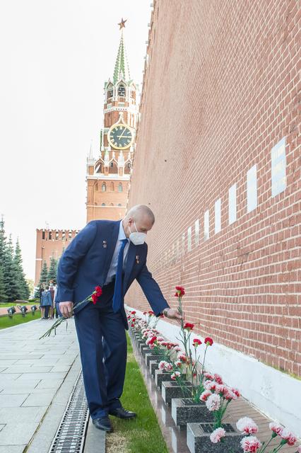 Expedition 64 backup crew member, Oleg Novitskiy of Roscosmos lays flowers at the site where Russian space icons are interred as part of traditional pre-launch ceremonies, Thursday, Sept. 24, 2020 at Red Square in Moscow. Photo Credit: (NASA/GCTC/Irina Spector)