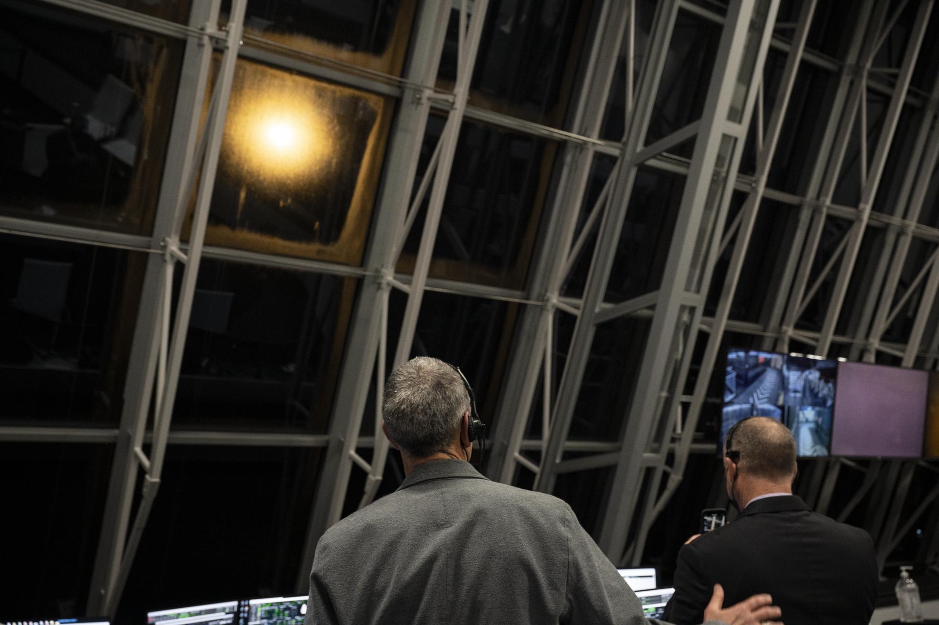 Lee Rosen, vice president, Mission and Launch Operations at SpaceX pats Norm Knight, deputy director of Flight Operations at NASA's Johnson Space Center on the back as they watch the launch of a SpaceX Falcon 9 rocket carrying the company's Crew Dragon spacecraft on NASA’s SpaceX Crew-1 mission with NASA astronauts Mike Hopkins, Victor Glover, Shannon Walker, and Japan Aerospace Exploration Agency (JAXA) astronaut Soichi Noguchi onboard, Sunday, Nov. 15, 2020, in firing room four of the Launch Control Center at NASA’s Kennedy Space Center in Florida. NASA’s SpaceX Crew-1 mission is the first crew rotation mission of the SpaceX Crew Dragon spacecraft and Falcon 9 rocket to the International Space Station as part of the agency’s Commercial Crew Program. Hopkins, Glover, Walker, and Noguchi launched at 7:27 p.m. EST, from Launch Complex 39A at the Kennedy Space Center. Photo Credit: (NASA/Aubrey Gemignani)