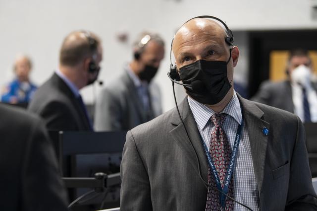 Michael Hess, acting associate director of NASA’s Johnson Space Center monitors the launch of a SpaceX Falcon 9 rocket carrying the company's Crew Dragon spacecraft on NASA’s SpaceX Crew-1 mission with NASA astronauts Mike Hopkins, Victor Glover, Shannon Walker, and Japan Aerospace Exploration Agency (JAXA) astronaut Soichi Noguchi onboard, Sunday, Nov. 15, 2020, in firing room four of the Launch Control Center at NASA’s Kennedy Space Center in Florida. NASA’s SpaceX Crew-1 mission is the first crew rotation mission of the SpaceX Crew Dragon spacecraft and Falcon 9 rocket to the International Space Station as part of the agency’s Commercial Crew Program. Hopkins, Glover, Walker, and Noguchi launched at 7:27 p.m. EST, from Launch Complex 39A at the Kennedy Space Center. Photo Credit: (NASA/Aubrey Gemignani)