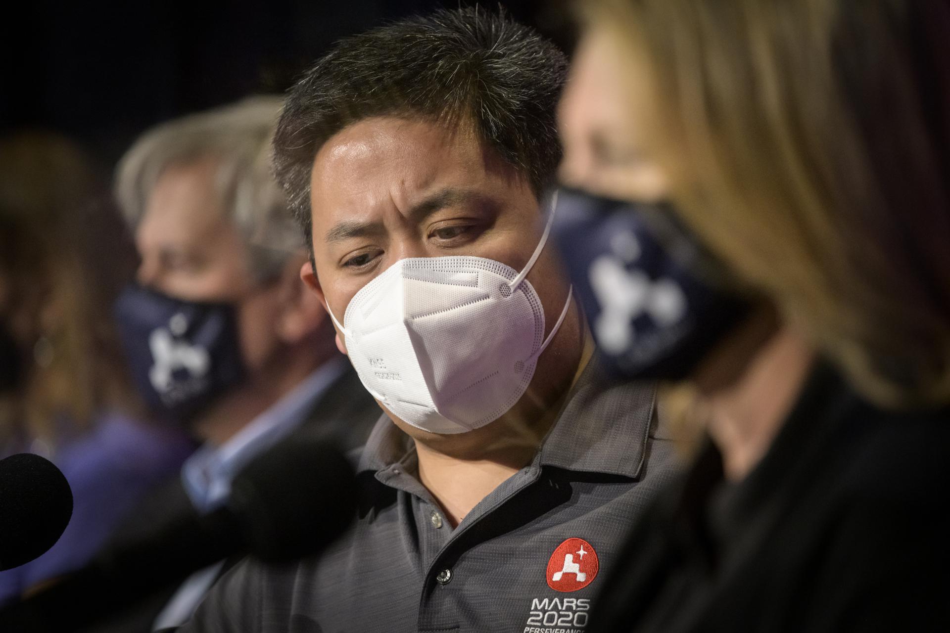 Perseverance entry, descent, and landing lead, JPL, Allen Chen, gives remarks during a NASA Perseverance rover mission landing update, Wednesday, Feb. 17, 2021, at NASA's Jet Propulsion Laboratory in Pasadena, California. The Perseverance Mars rover is due to land on Mars Thursday, Feb. 18, 2021. A key objective for Perseverance’s mission on Mars is astrobiology, including the search for signs of ancient microbial life. The rover will characterize the planet’s geology and past climate, pave the way for human exploration of the Red Planet, and be the first mission to collect and cache Martian rock and regolith. Photo Credit: (NASA/Bill Ingalls)