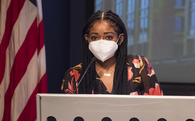 Artist Tenbeete Solomon, also known as Trap Bob, speaks during a ceremony officially naming the NASA Headquarters building in honor of Mary W. Jackson, Friday, Feb. 26, 2021, at NASA Headquarters in Washington, DC. Mary W. Jackson, the first African American female engineer at NASA, began her career with the agency in the segregated West Area Computing Unit of NASA’s Langley Research Center in Hampton, Virginia. The mathematician and aerospace engineer went on to lead programs influencing the hiring and promotion of women in NASA's science, technology, engineering, and mathematics careers. In 2019, she posthumously received the Congressional Gold Medal. Photo Credit: (NASA/Joel Kowsky)
