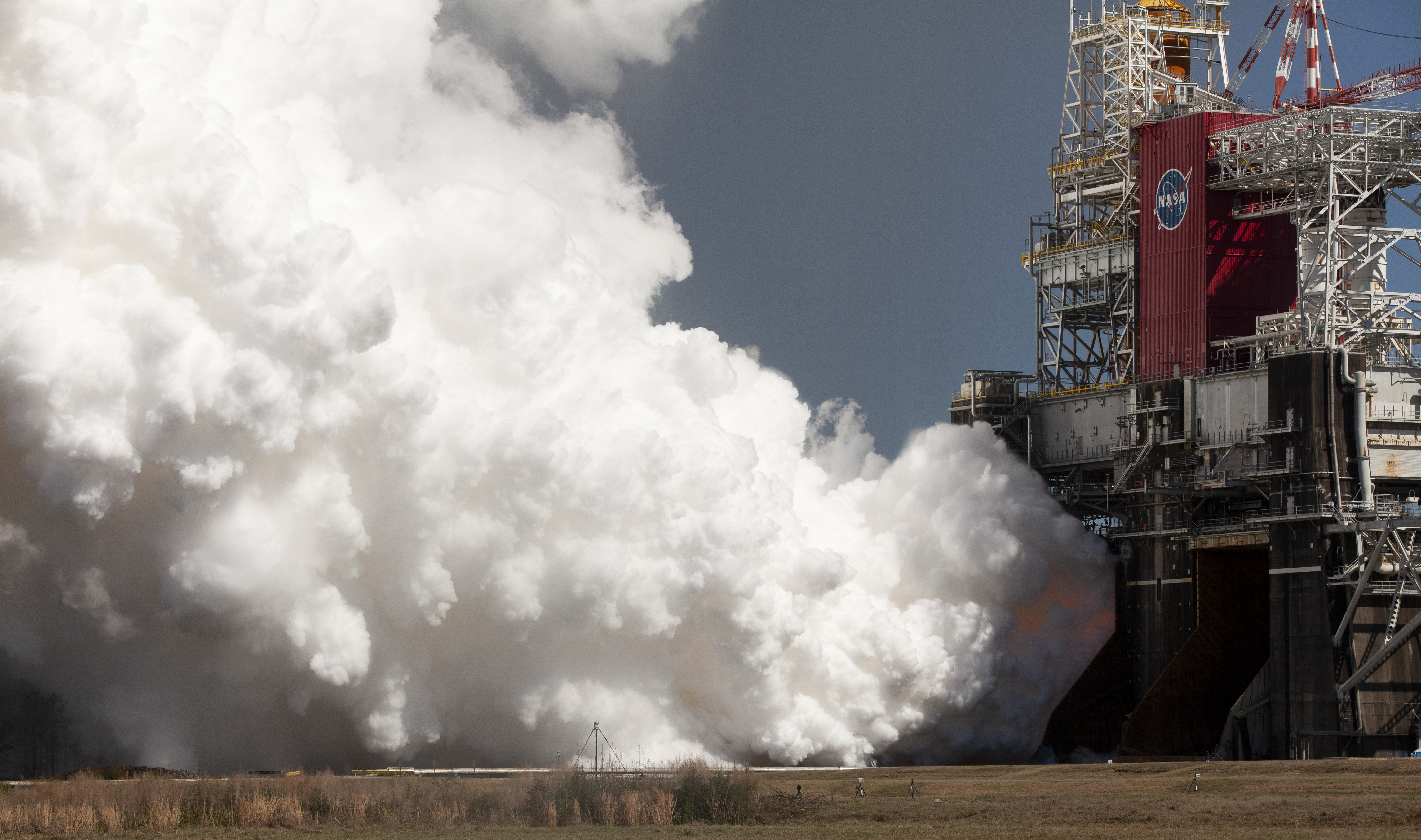 The core stage for the first flight of NASA’s Space Launch System rocket is seen in the B-2 Test Stand during a second hot fire test, Thursday, March 18, 2021, at NASA’s Stennis Space Center near Bay St. Louis, Mississippi. The four RS-25 engines fired for the full-duration of 8 minutes during the test and generated 1.6 million pounds of thrust. The hot fire test is the final stage of the Green Run test series, a comprehensive assessment of the Space Launch System’s core stage prior to launching the Artemis I mission to the Moon. Photo Credit: (NASA/Robert Markowitz)