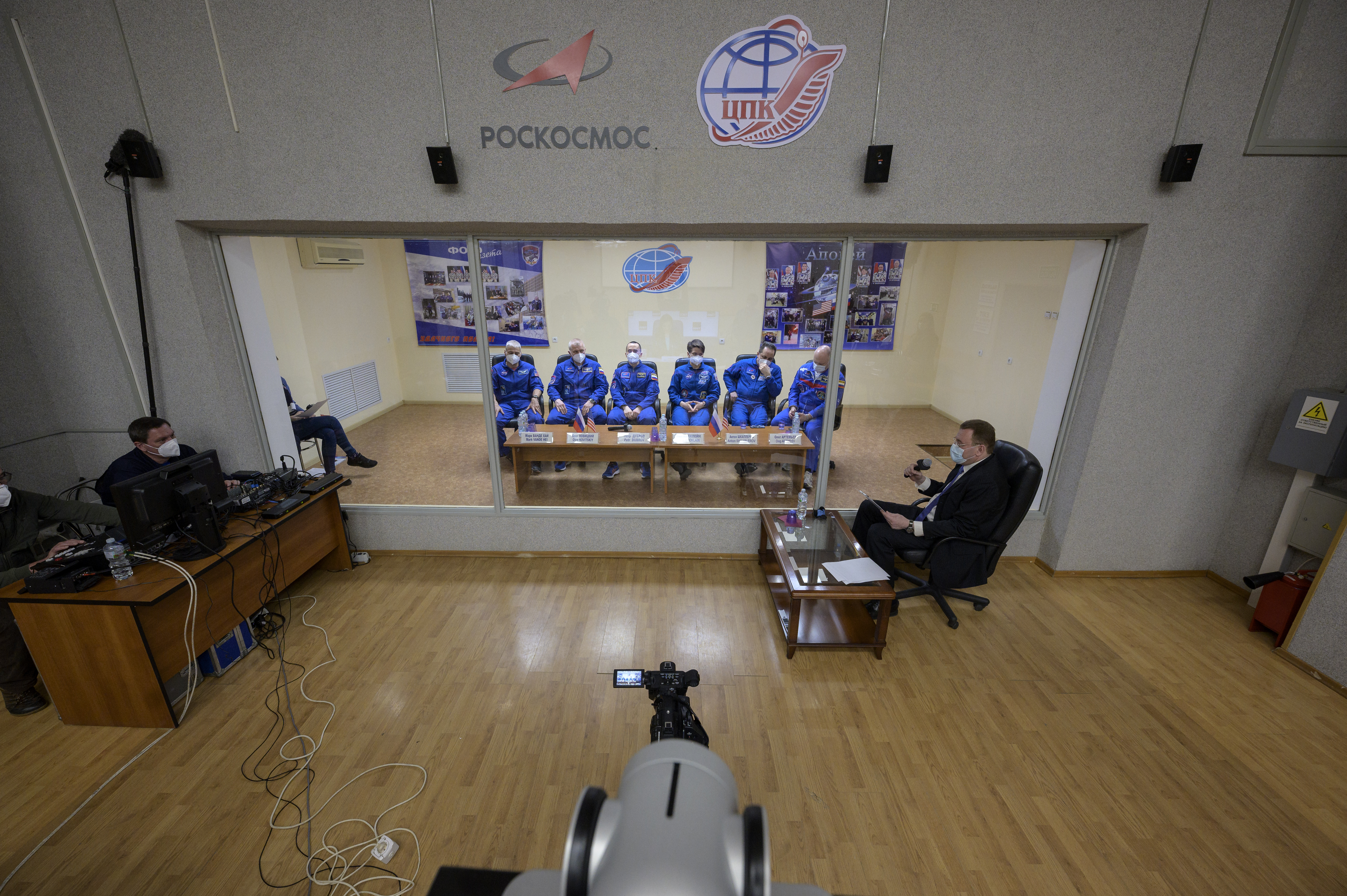 Expedition 65 NASA astronaut Mark Vande Hei, left, Roscosmos cosmonauts Oleg Novitskiy and Pyotr Dubrov, along with backup crew members Anne McClain of NASA, and Roscosmos cosmonauts Anton Shkaplerov and Oleg Artemyev, right, are seen in quarantine, behind glass, during a press conference, Thursday, April 8, 2021 a the Cosmonaut Hotel in Baikonur, Kazakhstan. The prime crew is scheduled to launch to the International Space Station aboard the Soyuz MS-18 spacecraft on April 9. Photo Credit: (NASA/Bill Ingalls)