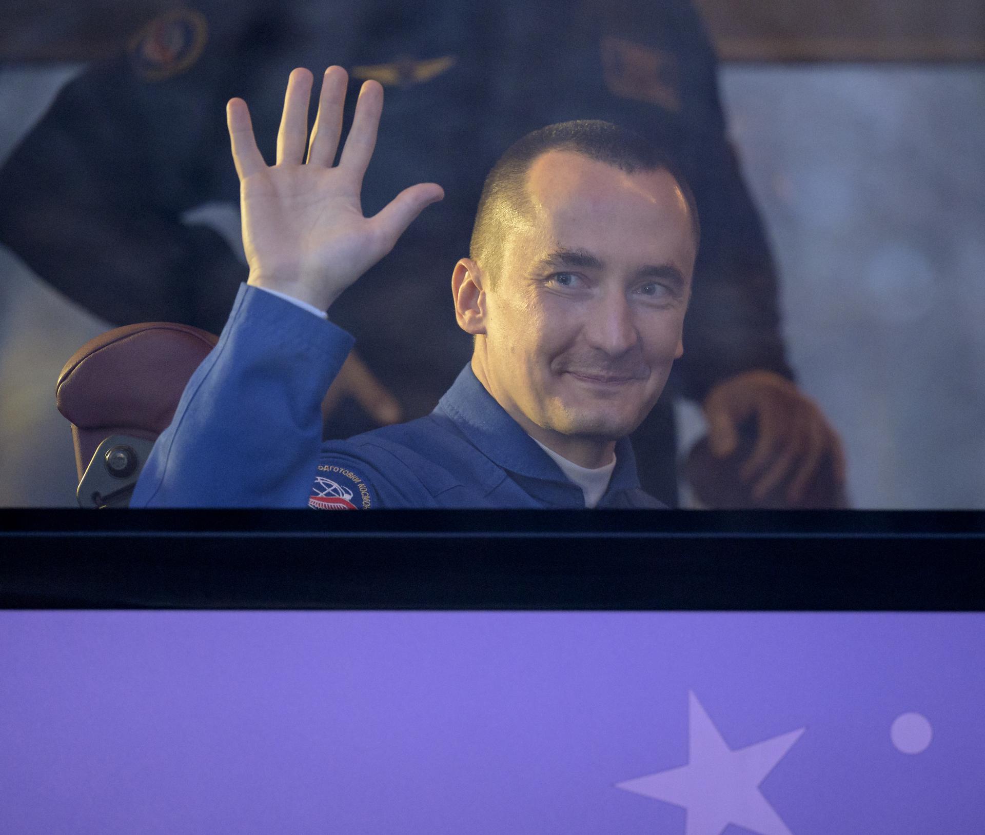 Expedition 65 Russian cosmonaut Pyotr Dubrov waves as he departs the Cosmonaut Hotel to suit-up with Russian cosmonaut Oleg Novitskiy and NASA astronaut Mark Vande Hei for their Soyuz launch to the International Space Station, Friday, April 9, 2021, in Baikonur, Kazakhstan. Photo Credit: (NASA/Bill Ingalls)