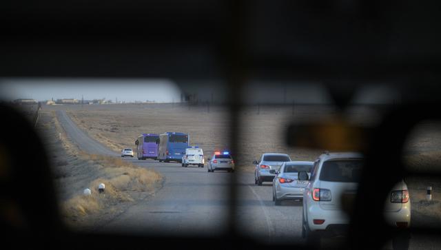 Expedition 65 prime and backup crew buses are escorted across the Baikonur Cosmodrome to building 254 for the prime crewmembers to don their Russian Sokol suits ahead of their Soyuz launch to the International Space Station Friday, April 9, 2021 in Baikonur, Kazakhstan. Photo Credit: (NASA/Bill Ingalls)