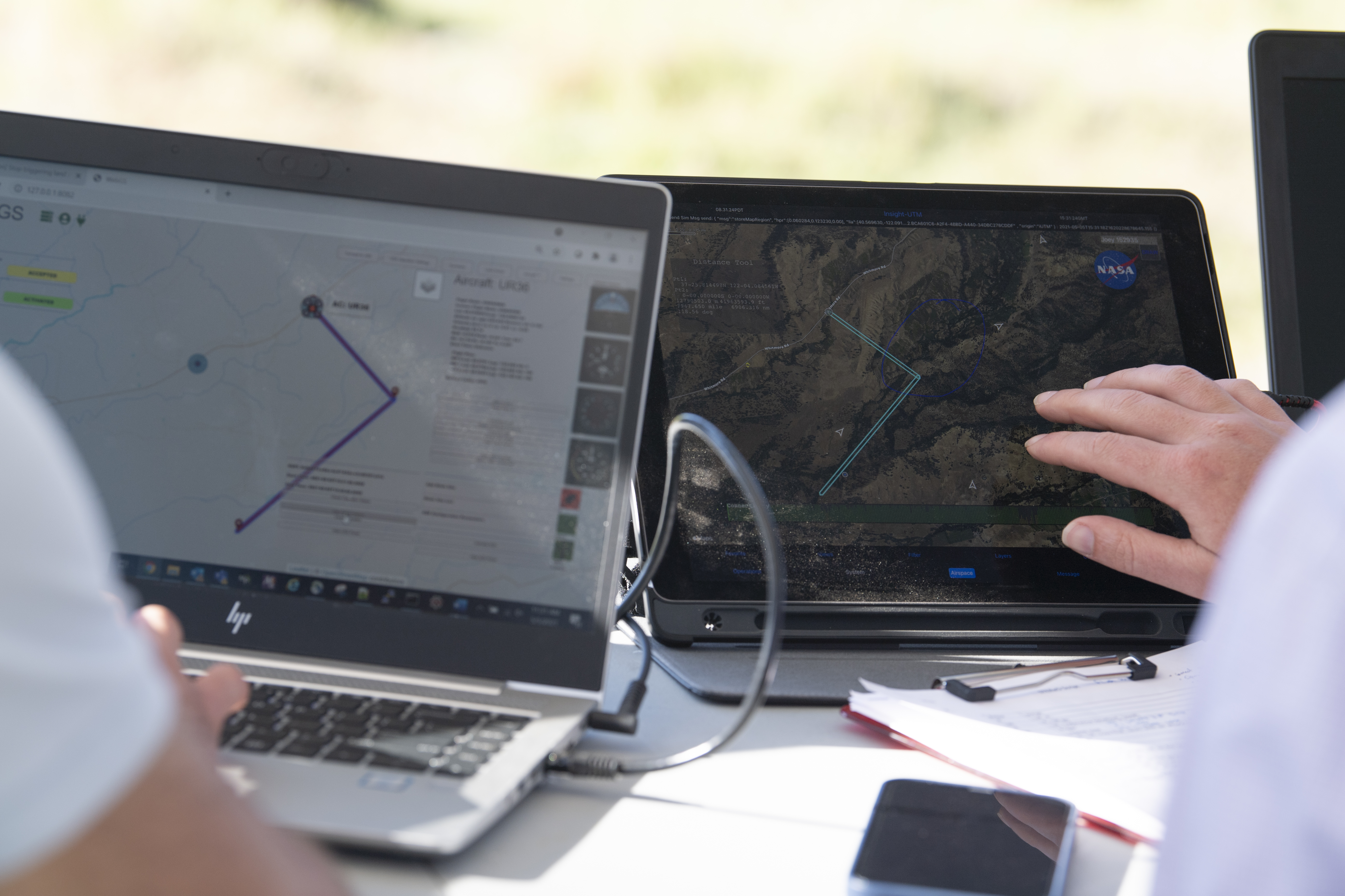 Bryan Petty, autonomy researcher for STEReO, the Scalable Traffic Management for Emergency Response Operations project, at NASA's Langley Research Center, left, and Robert McSwain, co-principle investigator and autonomy researcher for STEReO, the Scalable Traffic Management for Emergency Response Operations project, at NASA's Langley Research Center, right, are seen during simulated drone operations as part of STEReO field testing, Wednesday, May 5, 2021 as Cal Fire conducts aerial fire fighting training exercises near Redding, California. STEReO, the Scalable Traffic Management for Emergency Response Operations project, led by NASA’s Ames Research Center, builds on NASA’s expertise in air traffic management, human factors research, and autonomous technology development to apply the agency’s work in Unmanned Aircraft Systems Traffic Management, or UTM, to public safety uses. Photo Credit: (NASA/Joel Kowsky)