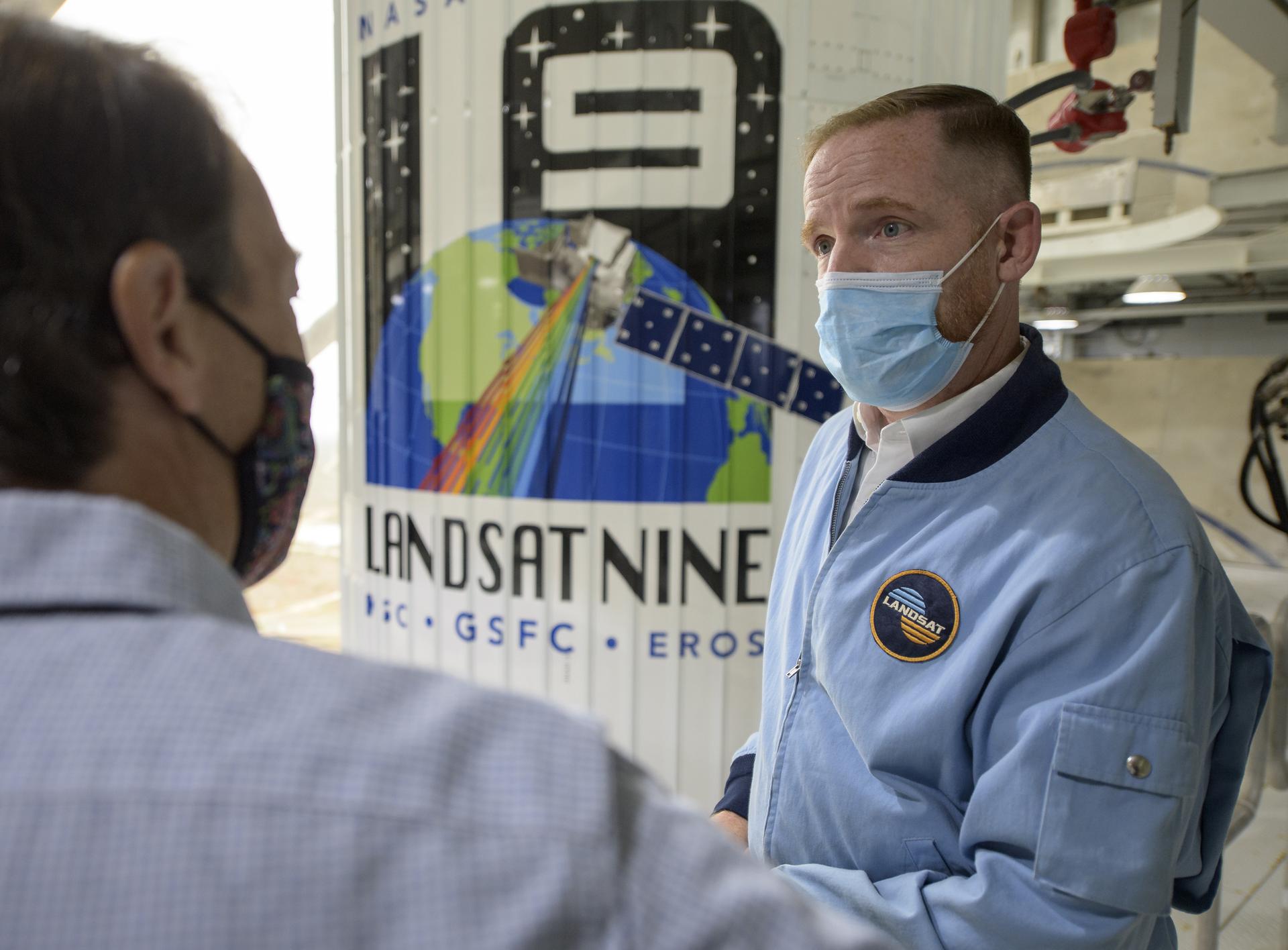 Actor Marc Evan Jackson listens as NASA Landsat 9 Project Scientist Jeff Masek, left, talk next to the United Launch Alliance (ULA) Atlas V rocket with the Landsat 9 satellite onboard, Sunday, Sept. 26, 2021, at Vandenberg Space Force Base in California. The Landsat 9 satellite, a joint NASA/U.S. Geological Survey mission that will continue the legacy of monitoring Earth’s land and coastal regions, is scheduled for liftoff Monday, Sept. 27. Photo Credit: (NASA/Bill Ingalls)