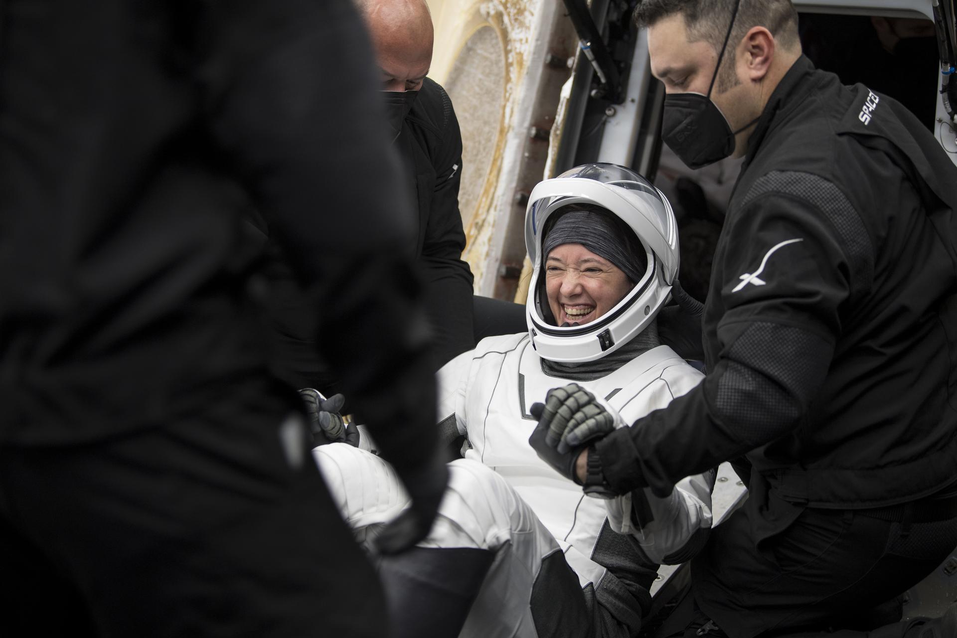 NASA astronaut Megan McArthur is helped out of the SpaceX Crew Dragon Endeavour spacecraft onboard the SpaceX GO Navigator recovery ship after she and NASA astronaut Shane Kimbrough, Japan Aerospace Exploration Agency (JAXA) astronaut Aki Hoshide, and ESA (European Space Agency) astronaut Thomas Pesquet landed in the Gulf of Mexico off the coast of Pensacola, Florida, Monday, Nov. 8, 2021. NASA’s SpaceX Crew-2 mission is the second operational mission of the SpaceX Crew Dragon spacecraft and Falcon 9 rocket to the International Space Station as part of the agency’s Commercial Crew Program. Photo Credit: (NASA/Aubrey Gemignani)