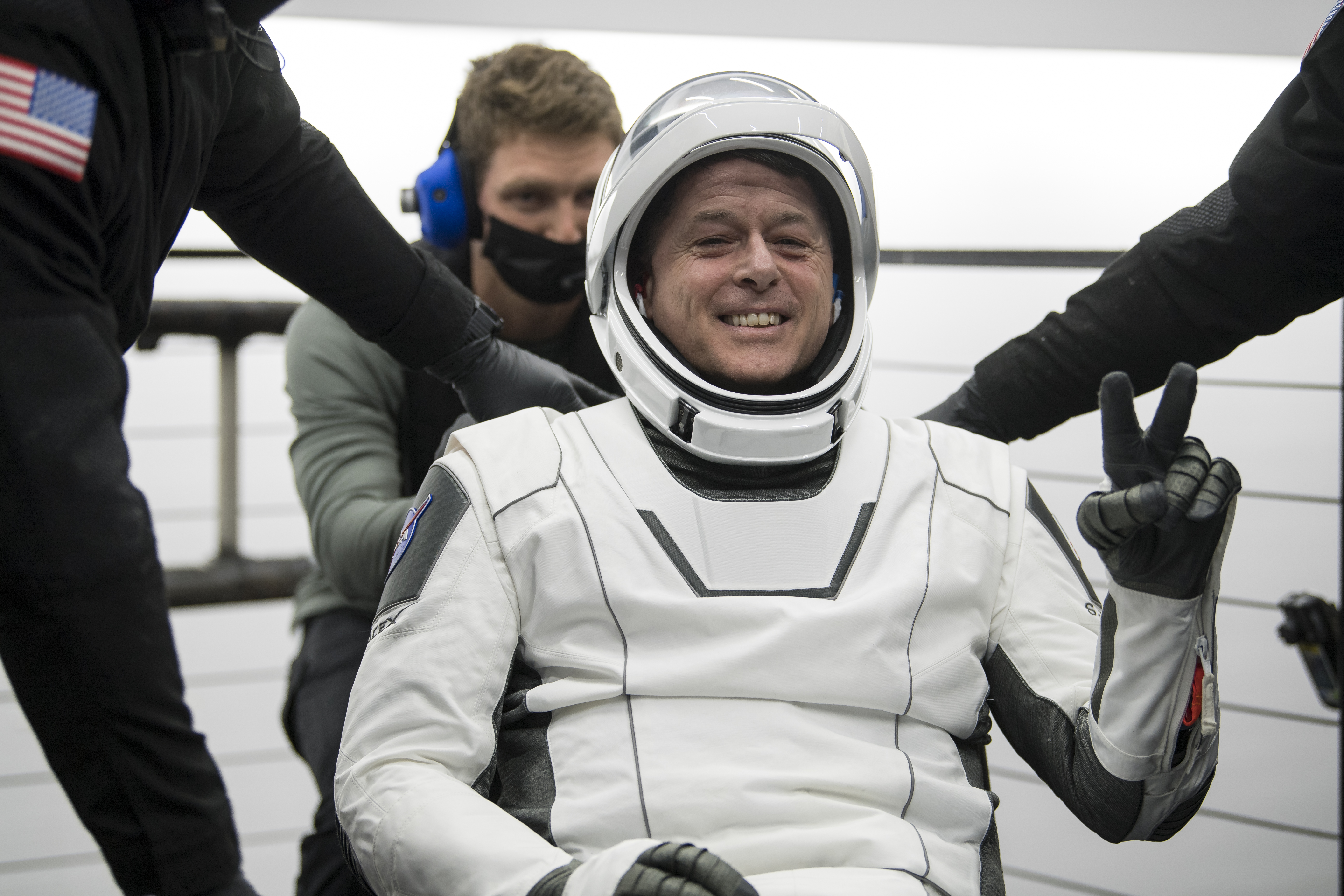 NASA astronaut Shane Kimbrough gives a hand sign after he was helped out of the SpaceX Crew Dragon Endeavour spacecraft onboard the SpaceX GO Navigator recovery ship after he and NASA astronaut Megan McArthur, Japan Aerospace Exploration Agency (JAXA) astronaut Aki Hoshide, and ESA (European Space Agency) astronaut Thomas Pesquet landed in the Gulf of Mexico off the coast of Pensacola, Florida, Monday, Nov. 8, 2021. NASA’s SpaceX Crew-2 mission is the second operational mission of the SpaceX Crew Dragon spacecraft and Falcon 9 rocket to the International Space Station as part of the agency’s Commercial Crew Program. Photo Credit: (NASA/Aubrey Gemignani)