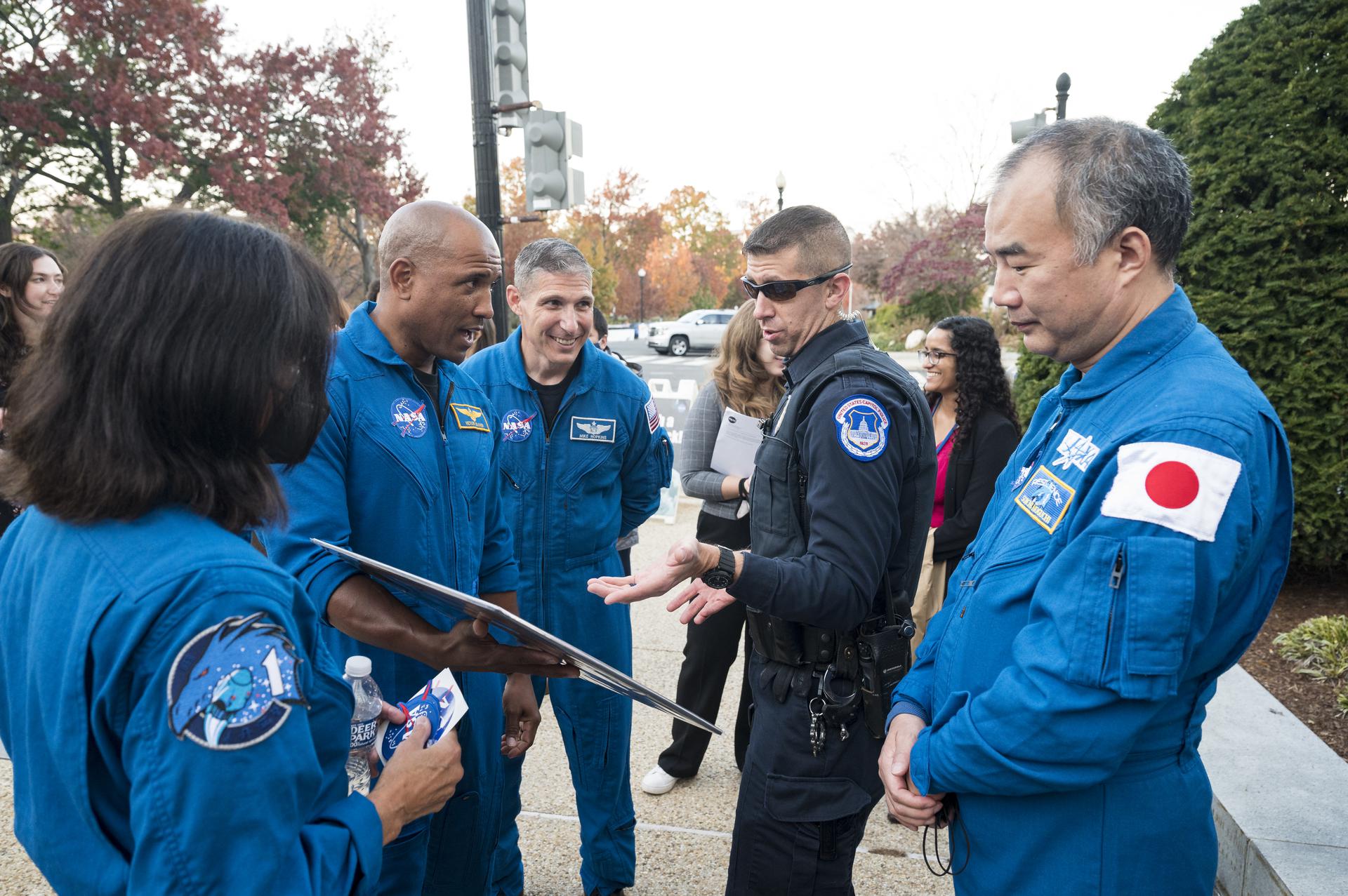 SpaceX Crew-1 NASA astronauts, from left to right, Shannon Walker, Victor Glover, Mike Hopkins, and Japan Aerospace Exploration Agency (JAXA) astronaut Soichi Noguchi, right, presents a montage from their mission to Capitol Police officer Jason Conlon at the Destination Station mobile exhibition on Capitol Hill, Wednesday, Nov. 17, 2021, in Washington. Walker, Glover, Hopkins, and Noguchi launched on the first crew rotation mission to the International Space Station for SpaceX’s Falcon 9 and Crew Dragon spacecraft as part of the agency’s Commercial Crew Program and spent 168 days in space across Expeditions 64 and 65. Photo Credit: (NASA/Aubrey Gemignani)