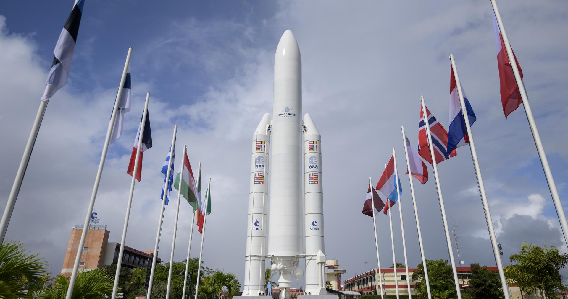 A mockup of Arianespace's Ariane 5 rocket is seen at the entrance to the Guiana Space Center in Kourou, French Guiana, Tuesday, Dec. 21, 2021. The James Webb Space Telescope (sometimes called JWST or Webb) is a large infrared telescope with a 21.3 foot (6.5 meter) primary mirror. The observatory is scheduled to launch later in the week and will study every phase of cosmic history—from within our solar system to the most distant observable galaxies in the early universe. Photo Credit: (NASA/Bill Ingalls)