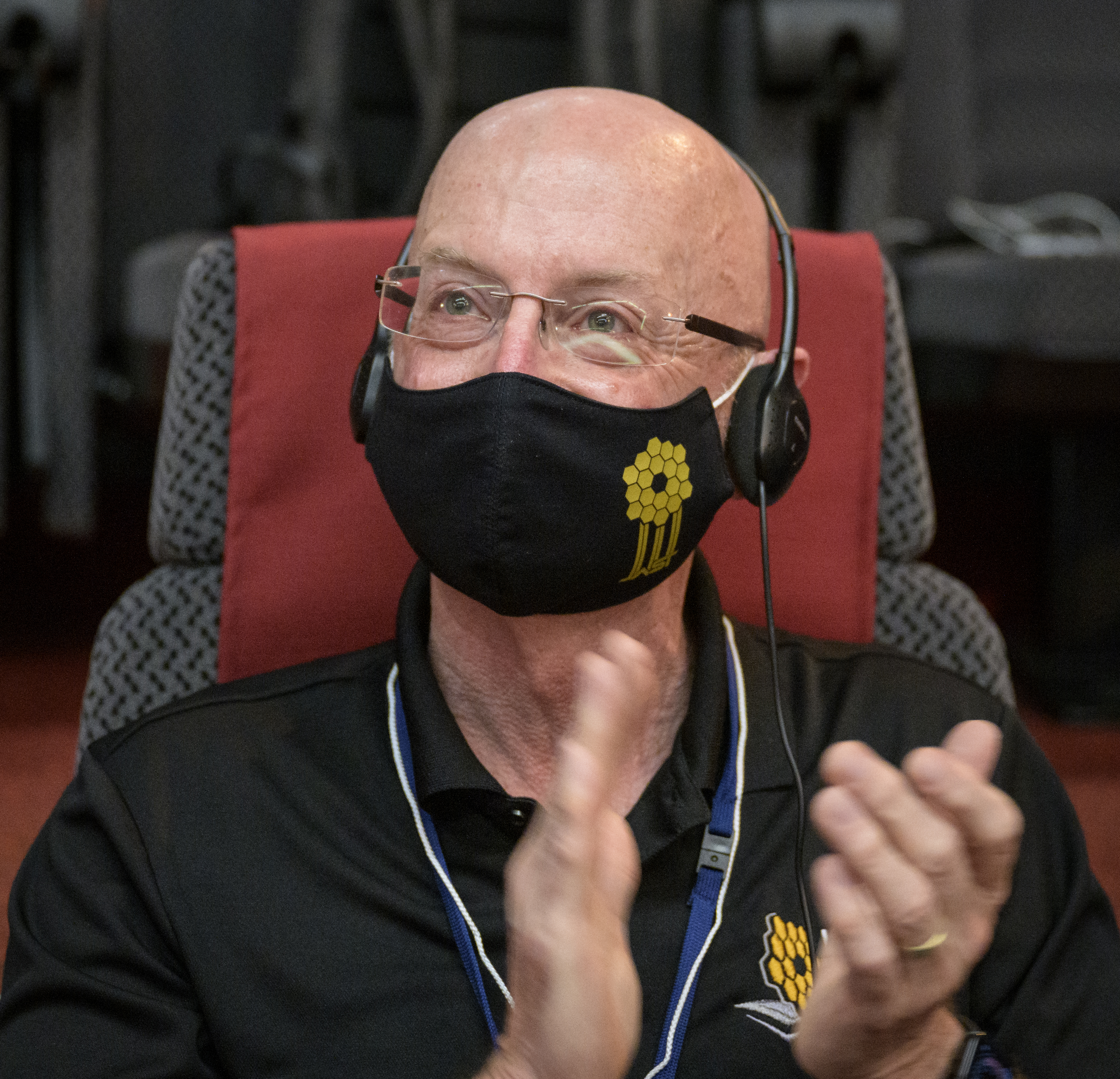 NASA James Webb Space Telescope Program Scientist Eric Smith reacts after hearing confirmation that the James Webb Space Telescope successfully separated from the Ariane 5 rocket, Saturday, Dec. 25, 2021, in the Jupiter Hall of the Guiana Space Centre in Kourou, French Guiana. The James Webb Space Telescope (sometimes called JWST or Webb) is a large infrared telescope with a 21.3 foot (6.5 meter) primary mirror. The observatory will study every phase of cosmic history—from within our solar system to the most distant observable galaxies in the early universe. Photo Credit: (NASA/Bill Ingalls)