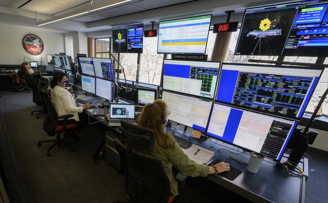 NASA James Webb Space Telescope Mission team members monitor the progress of Webb’s second primary mirror wing latching, Saturday, Jan. 8, 2022, in Baltimore. When fully latched, the infrared observatory will have completed its unprecedented process of unfolding in space to prepare for science operations. Webb will study every phase of cosmic history—from within our solar system to the most distant observable galaxies in the early universe. Photo Credit: (NASA/Bill Ingalls)